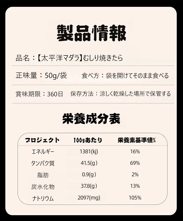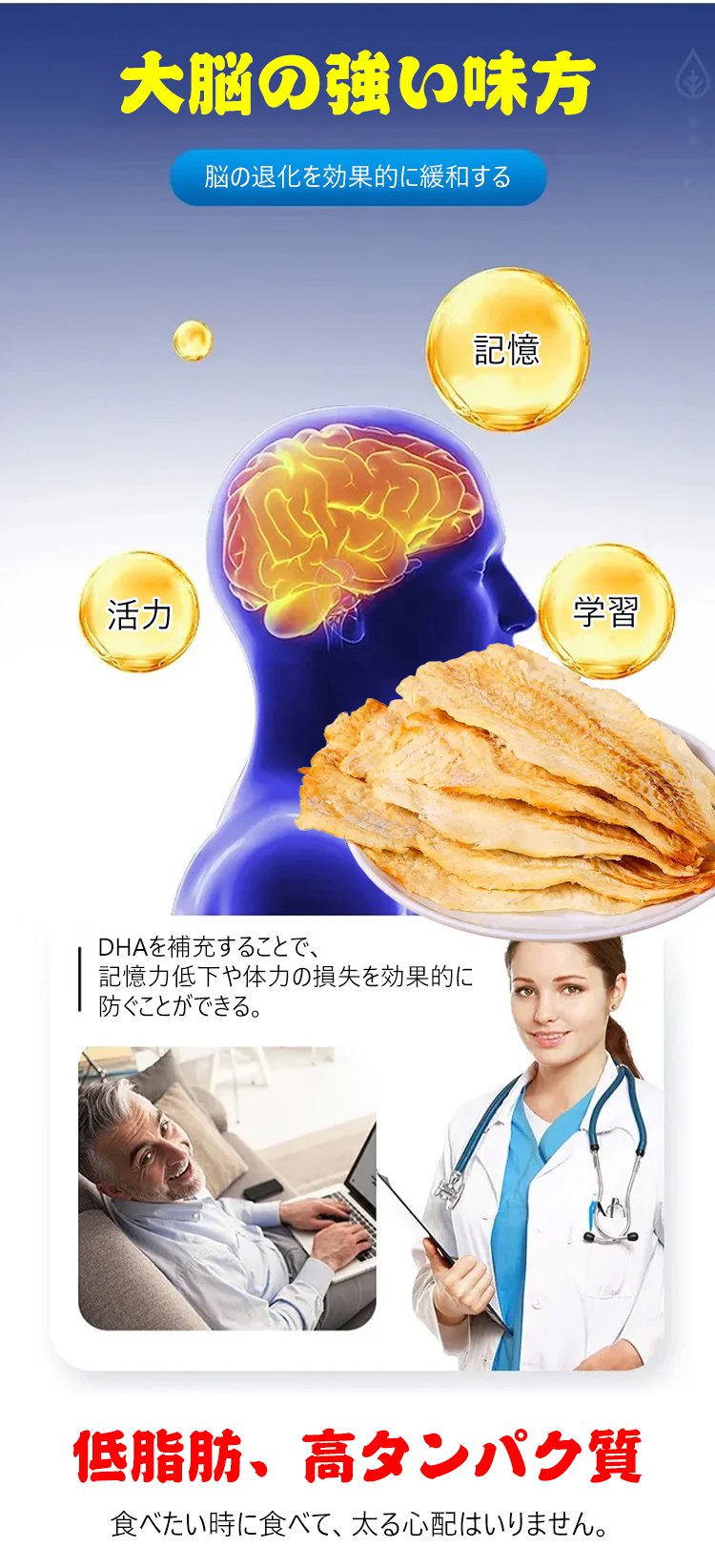 低脂肪、高タンパク質、添加物ゼロ、保存料ゼロ、さまざまなミネラル、ビタミン、オメガ3脂肪酸、DHAなどの栄養素が豊富で、血圧の調整、心臓の保護、免疫力の向上、脳の発達の促進、記憶力の向上に役立ちます。