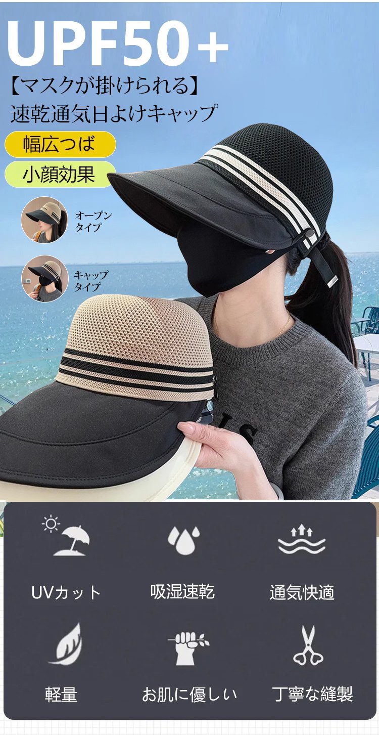 【マスクが掛けられる】速乾通気つば広日よけキャップ